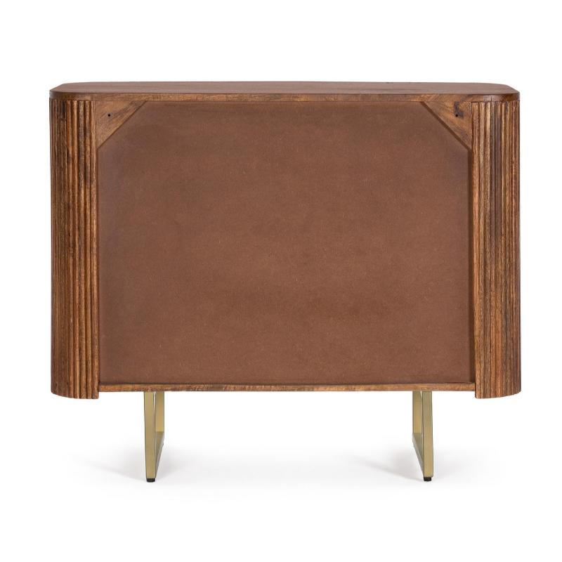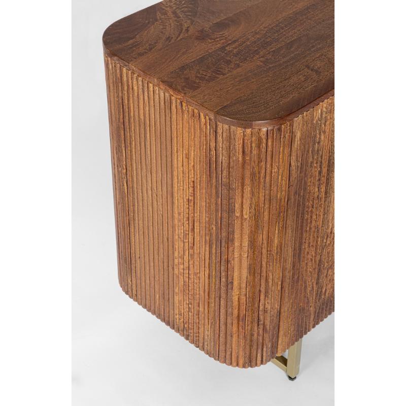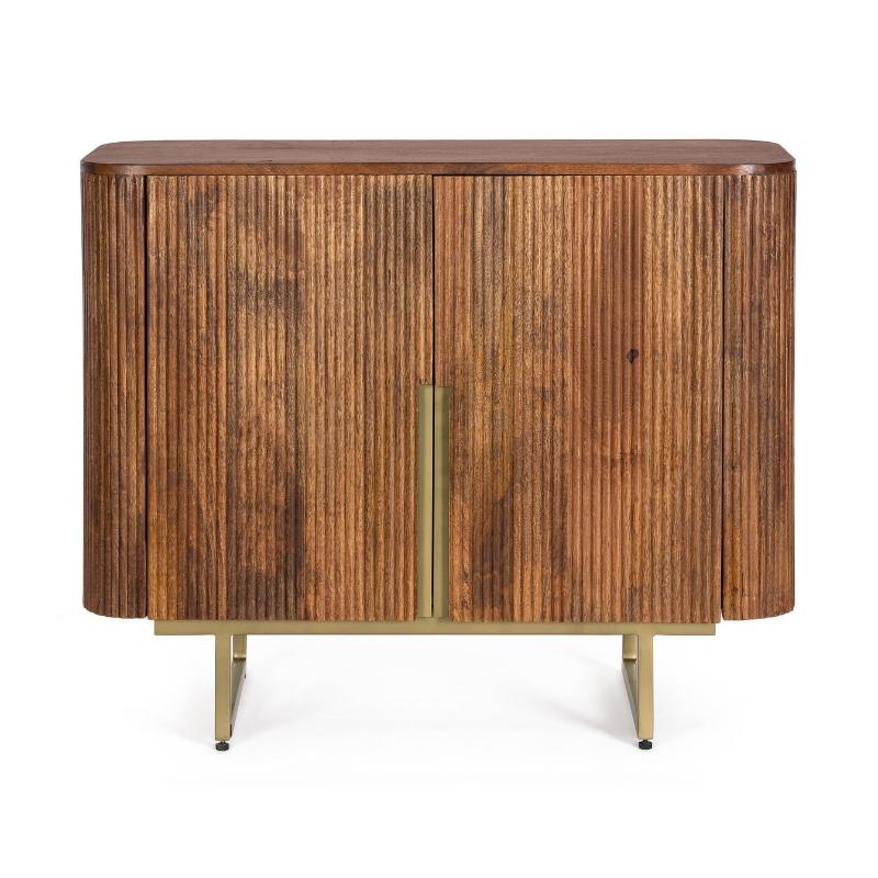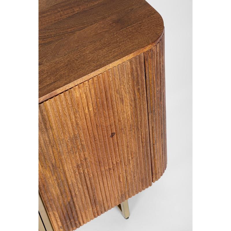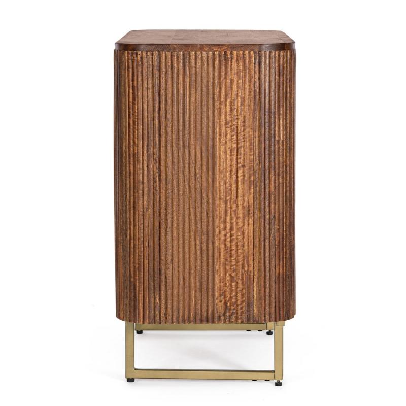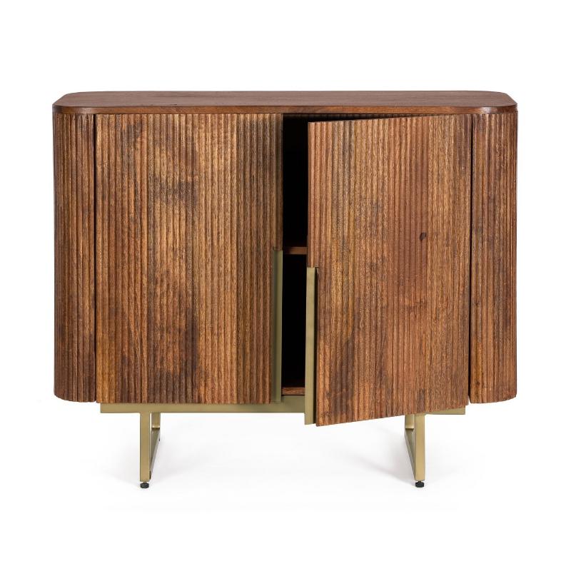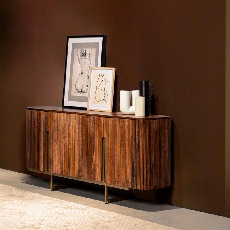 Aparador curvo de estilo rústico / moderno, de madera de mango maciza natural, patas y manillas de acero barnizado dorado. Mueble artesanal.