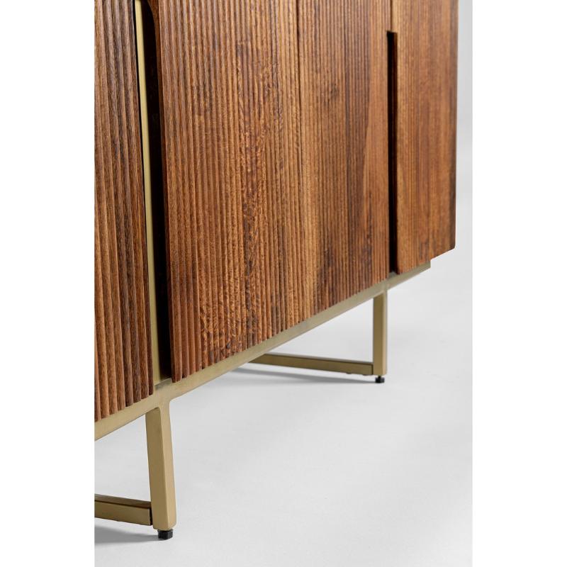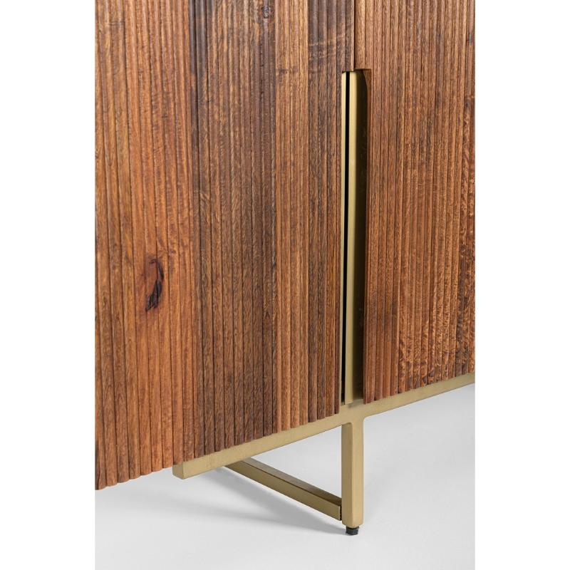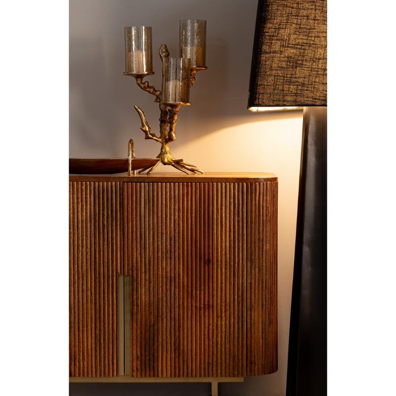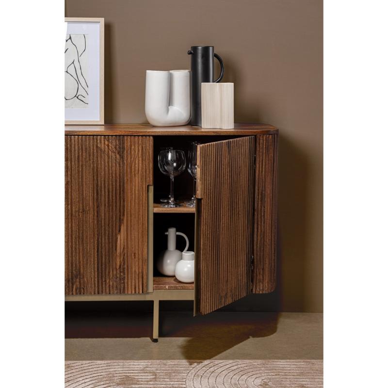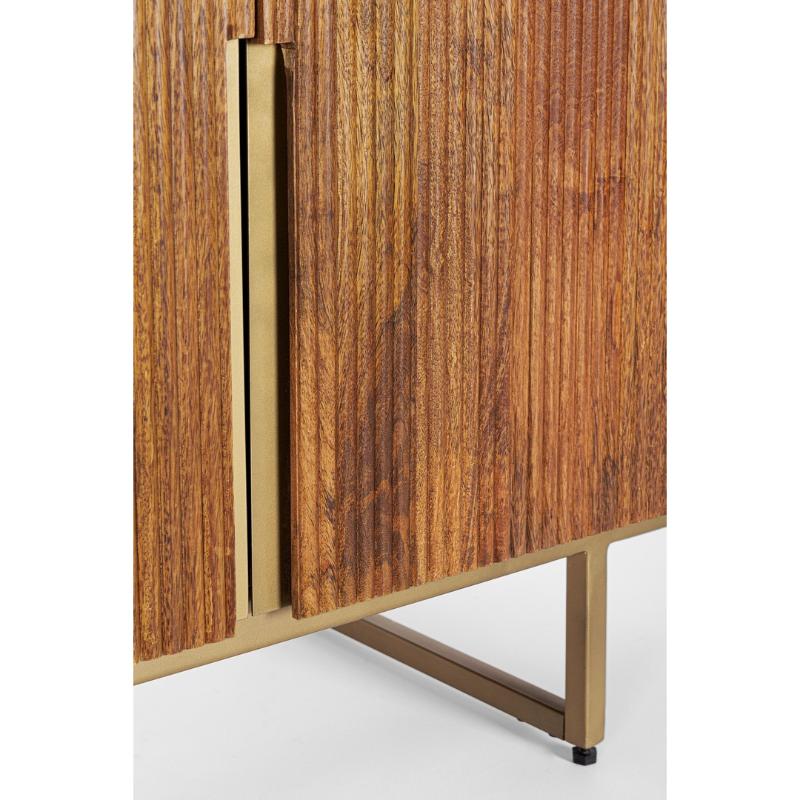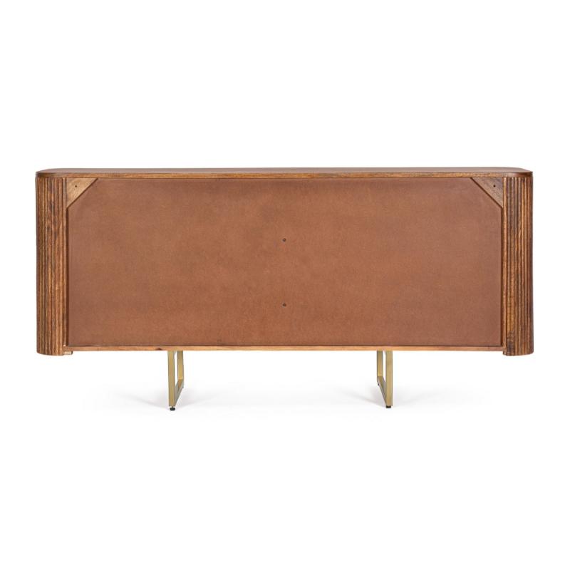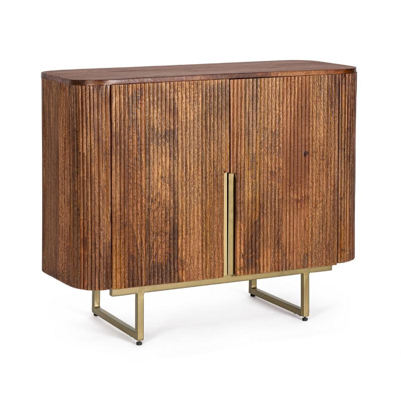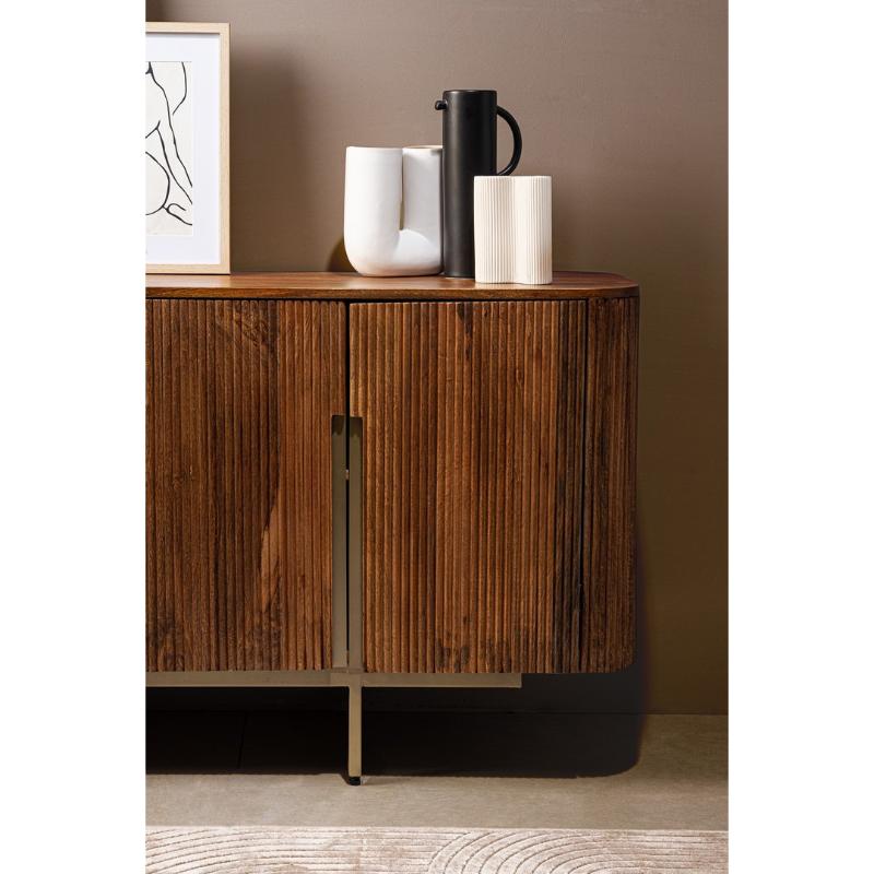 Aparador curvo de estilo rústico / moderno, de madera de mango maciza natural, patas y manillas de acero barnizado dorado. Mueble artesanal.