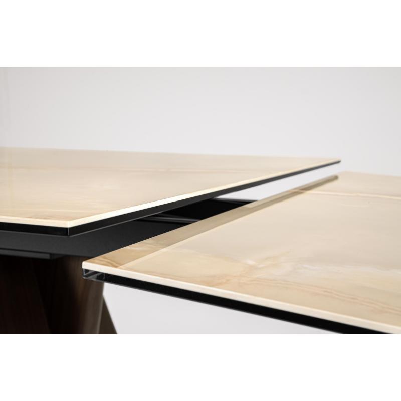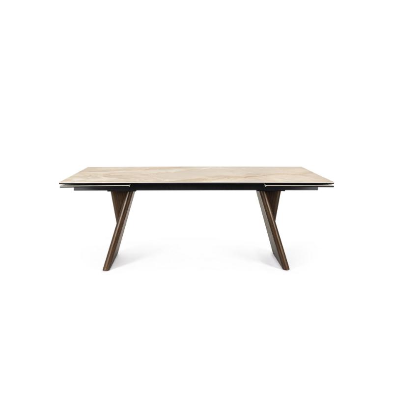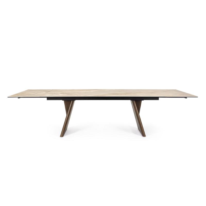 Esta preciosa mesa de comedor extensible de cerámica efecto Ónix sobre cristal templado, super resistente y duradera, con patas de madera maciza de Abedul chapeado con madera natural de Nogal. Extensible hasta 240 cm. de largo. Para de 8 a 10 comensales.