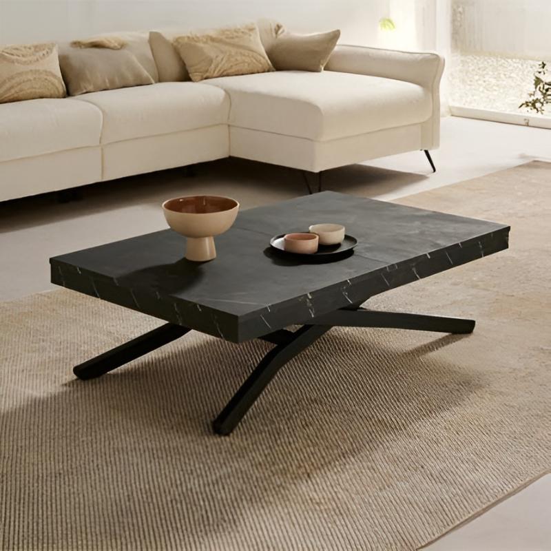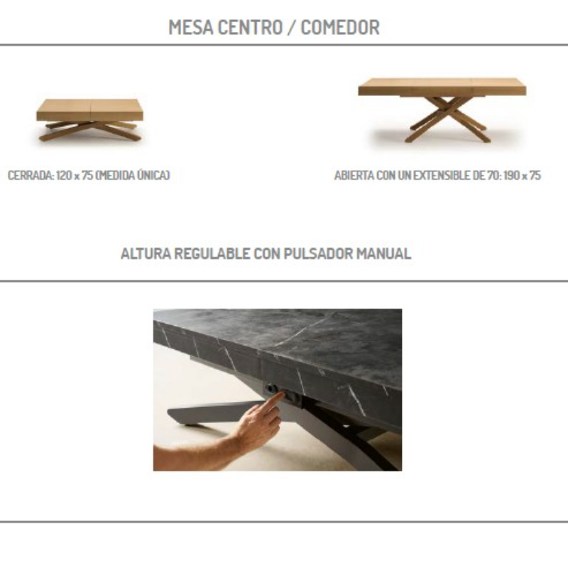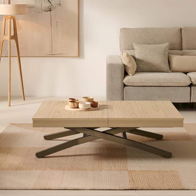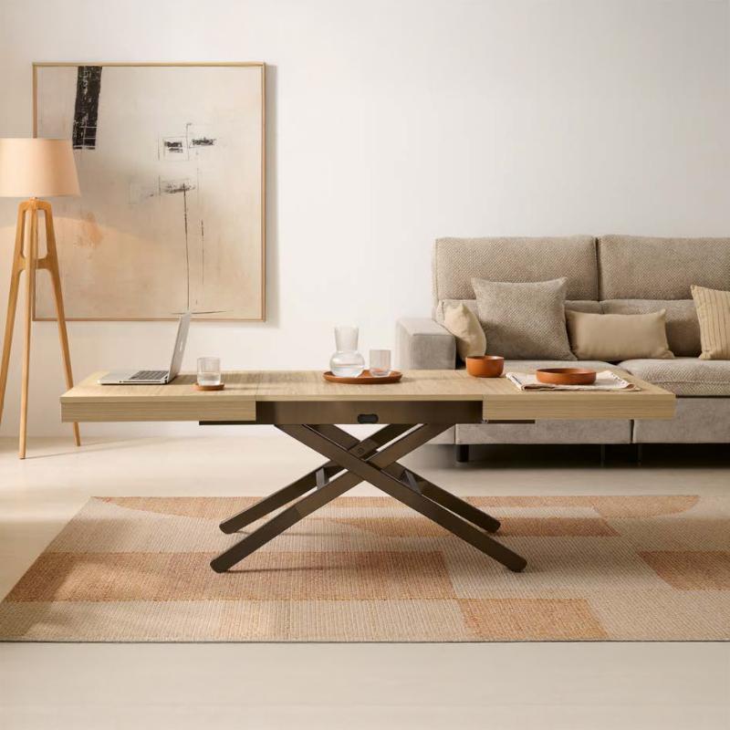 Mesa de centro elevable y convertible automática eléctrica, en madera y patas metálicas.