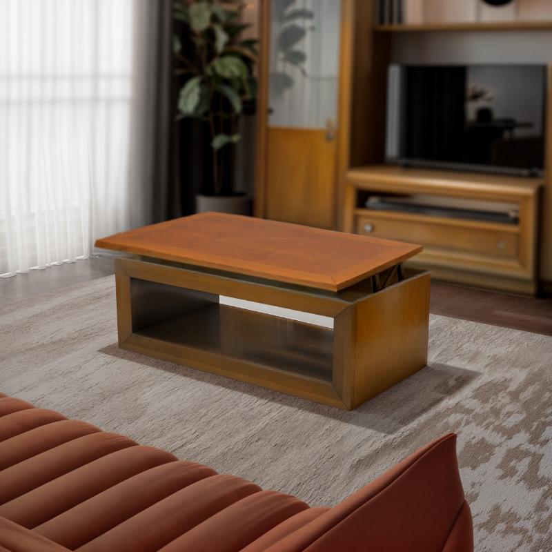 Mesa centro elevable, robusta de fabricación artesanal en chapa natural Aliso (familia cerezo) color cerezo. Con espacio bajo la misma donde guardar libros, revistas, etc. al alcance de la mano. De fabricación propia no la encontrarás en otro sitio. El lugar perfecto para dejar una taza de té mientras descansas.