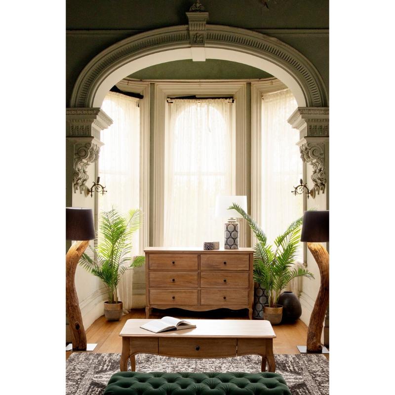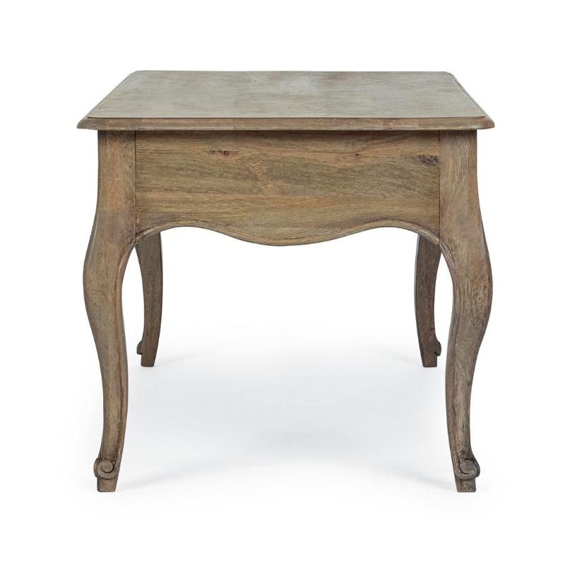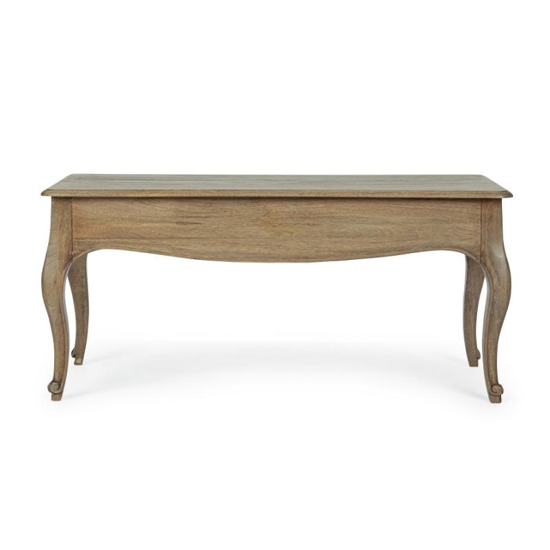 Mesa de centro de madera de mango maciza y patas de estilo isabelino, acabado natural. Con esquinas redondeadas. Tirador de fundición de hierro, sencillo y bonito. Cada artículo es diferente y la forma del tablero es orientativa, ya que está hecho a mano. Las formas y las medidas originales de la madera son indicativas, cada producto es diferente y único.
