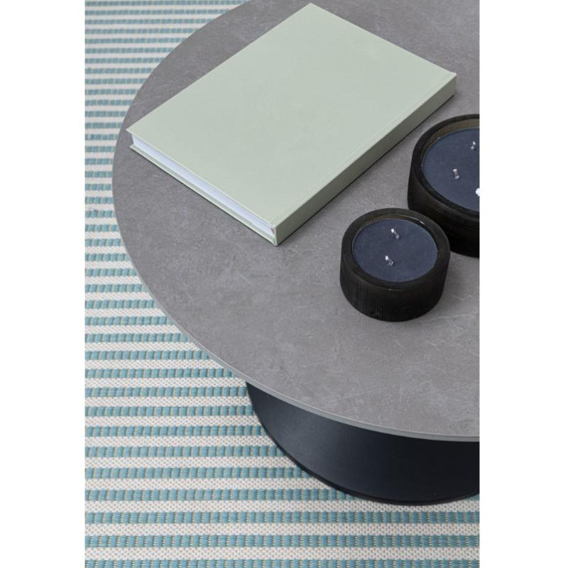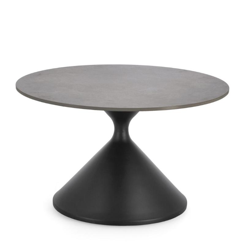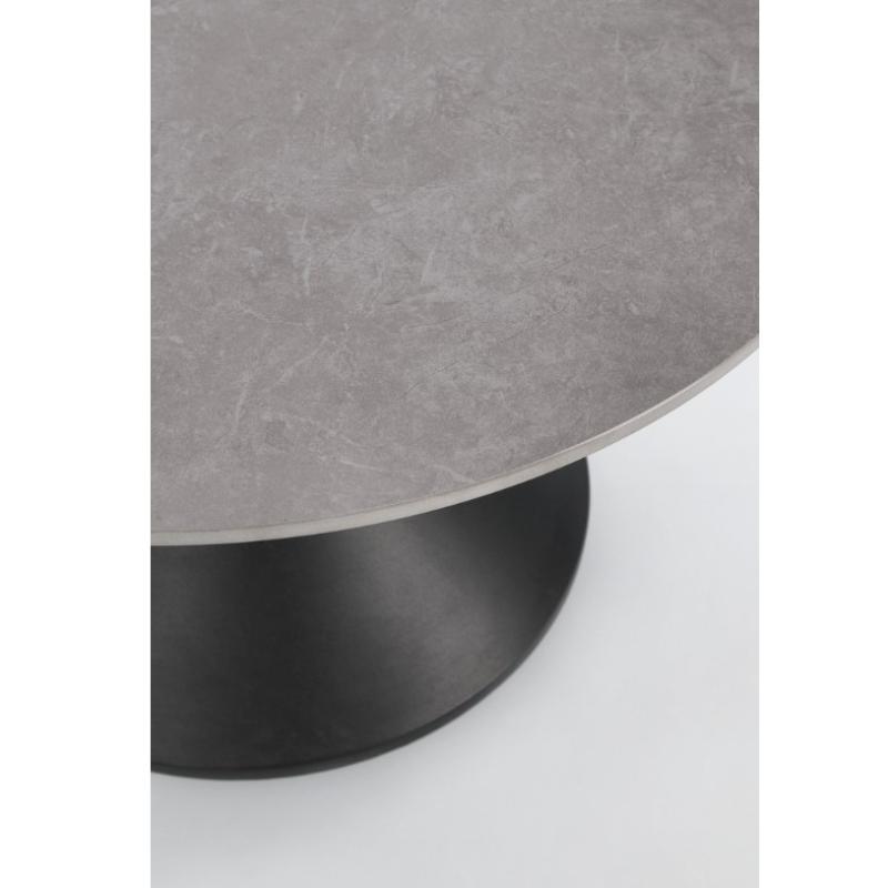 Mesa de centro con encimera de gres porcelánico efecto mármol gris mate, y pata de acero barnizado en polvo epoxi negra, para mayor durabilidad.