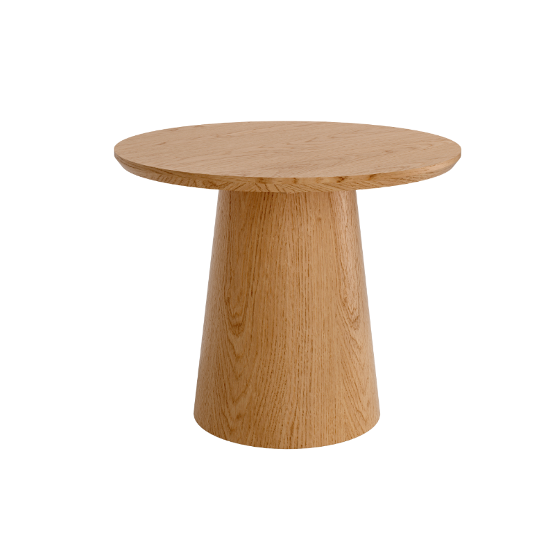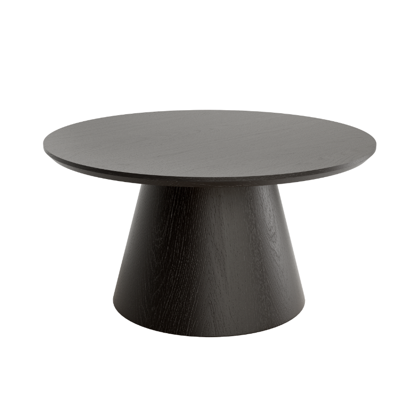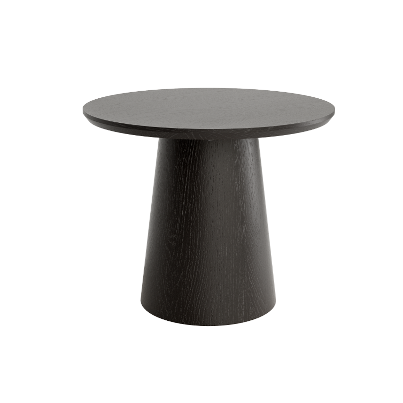 Mesa de Centro Nama redonda con pata circular cónica de madera, muy moderna, en acabado ecomadera en varios colores a escoger. En 2 tamaños diferentes a escoger, de diámetro 80cm y altura 42cm, o de diámetro 60cm y altura 50cm.