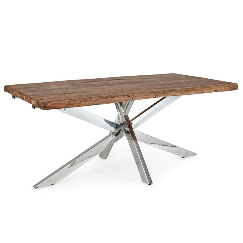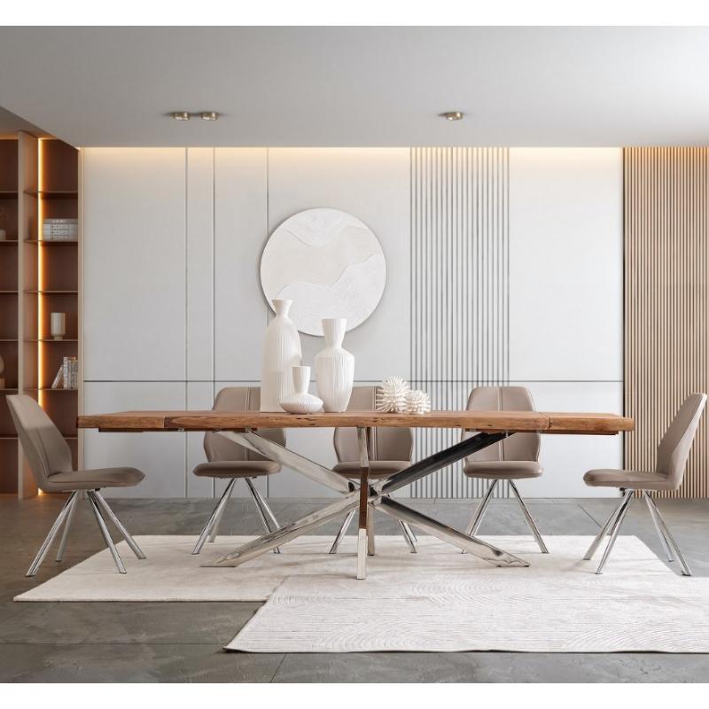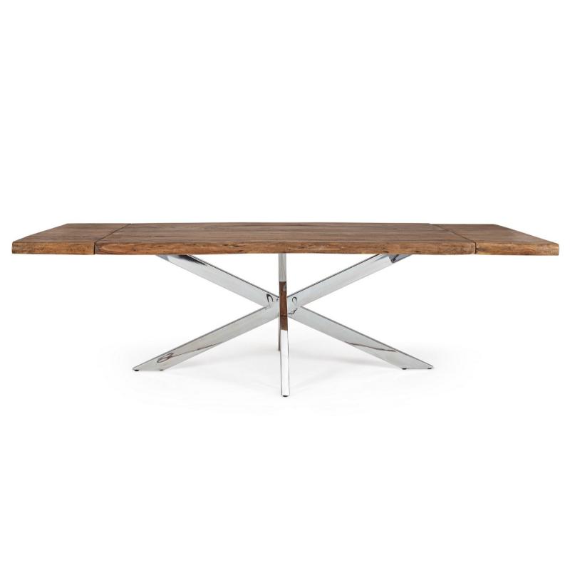 Tablero de madera de Acacia. Y patas de acero cromado inoxidable. Es un artículo único y la fotografía es orientativa, puede variar la forma de la madera. Perfecto para de 8 a 10 comensales. Dispone de 2 extensiones que la convierten en una espectacular mesa de 260 cm.