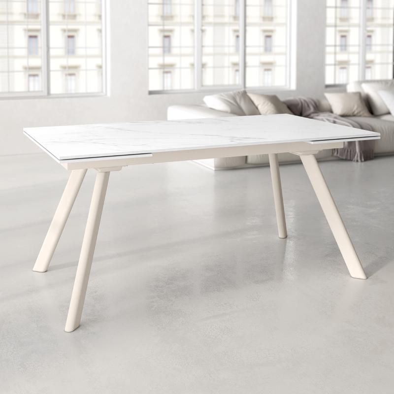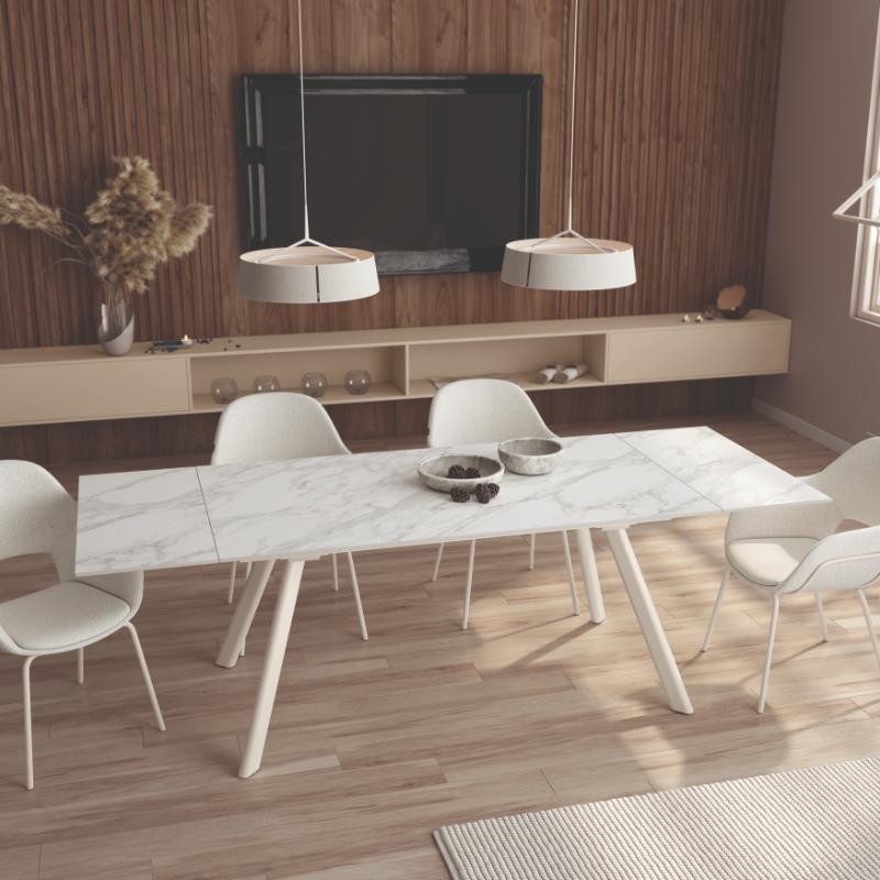 Mesa de comedor extensible con encimera de mármol natural, y patas metálicas blancas.