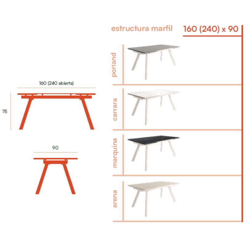 Mesa Nora, Mesa de comedor extensible con encimera de mármol natural: Porland, Carrara, Marquina. Con patas metálicas en acabado blanco (Disponible con patas negras en ésta web). Perfecta para salones o cocinas modernas, de 160 cm de larga extensible hasta 240 cm, para de 4 a 10 comensales. Mesa de comedor con un diseño muy actual, de estilo industrial y urbano, pero que encaja en cualquier tipo de decoración a la perfección. Escoge la combinación que encaje mejor con tu estilo, las posibles combinaciones diferentes porcelánicos y metales.