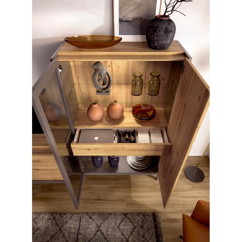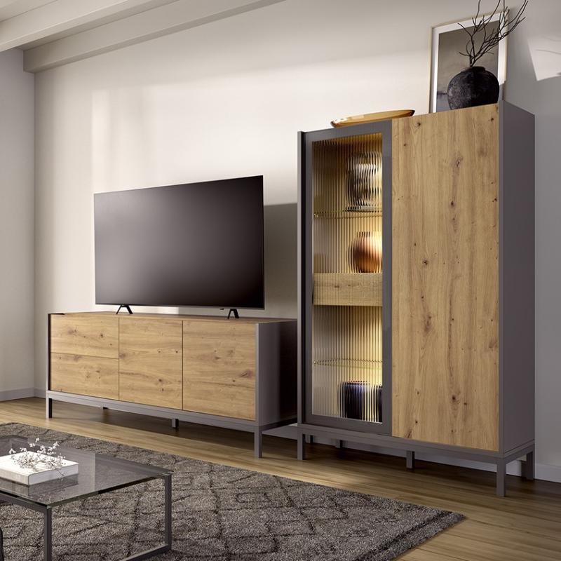 En el salón Milo encontramos por un lado un mueble de TV con 2 puertas y 2 cajones, con mucho espacio de almacenaje; y por otro lado un modulo alto con puerta de cristal flute y estantes de cristal, que rompe con el resto del acabado del mueble y queda muy bonito, y otra puerta de madera. En su parte interior con baldas para guardar ahí vajilla o todo lo que necesites.