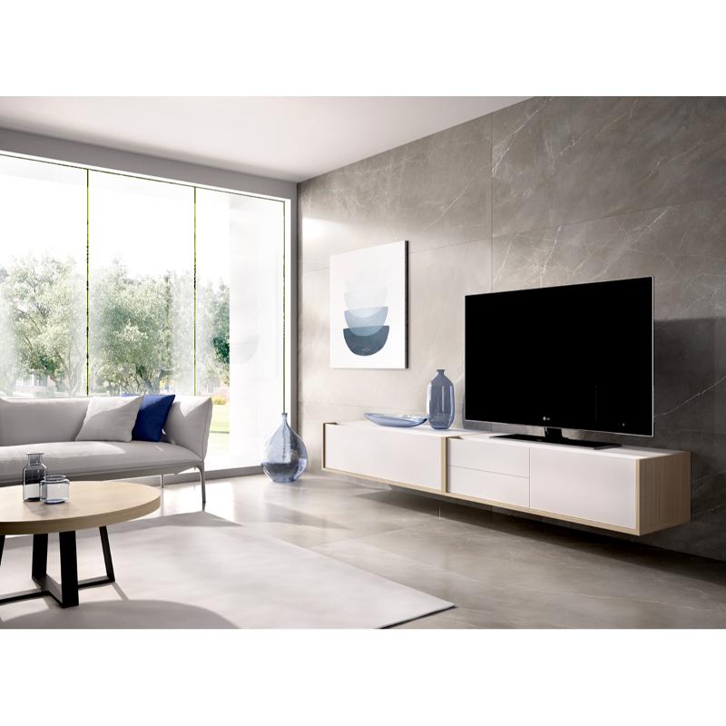 Mueble Salón Ivonne está fabricado en ecomadera, e incluye sistema de guías metálicas en cajones. Así como tiradores uñeros y sistemas push que dejan el frontal del mueble completamente limpio.