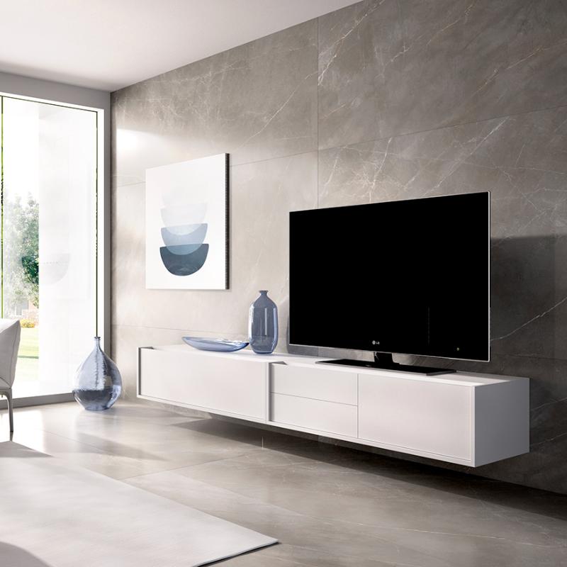 Mueble Salón Reyes. Mueble de TV colgado blanco, pensado para las personas que aman las líneas sencillas y actuales. Con un amplio mueble de TV con 2 cajones y 2 puertas abatible amplias. Posibilidad de incorporarle diferentes apoyos de patas y zócalo e lugar de colgado.
