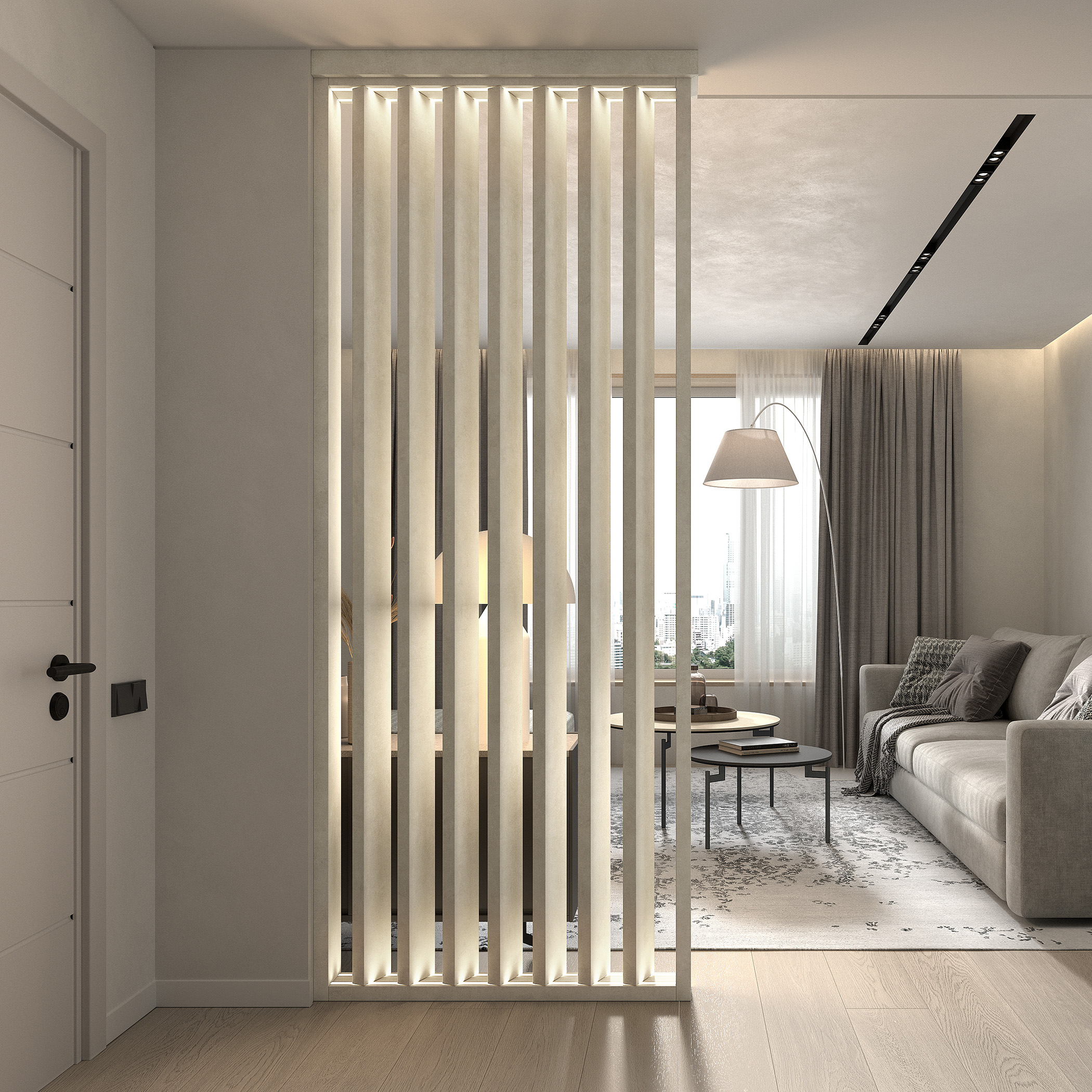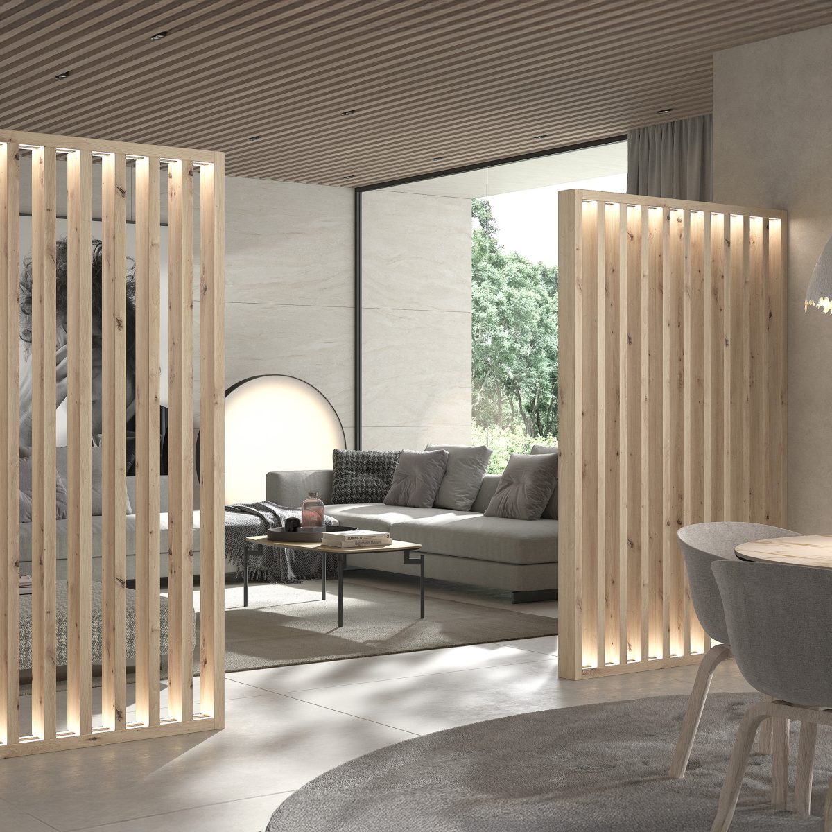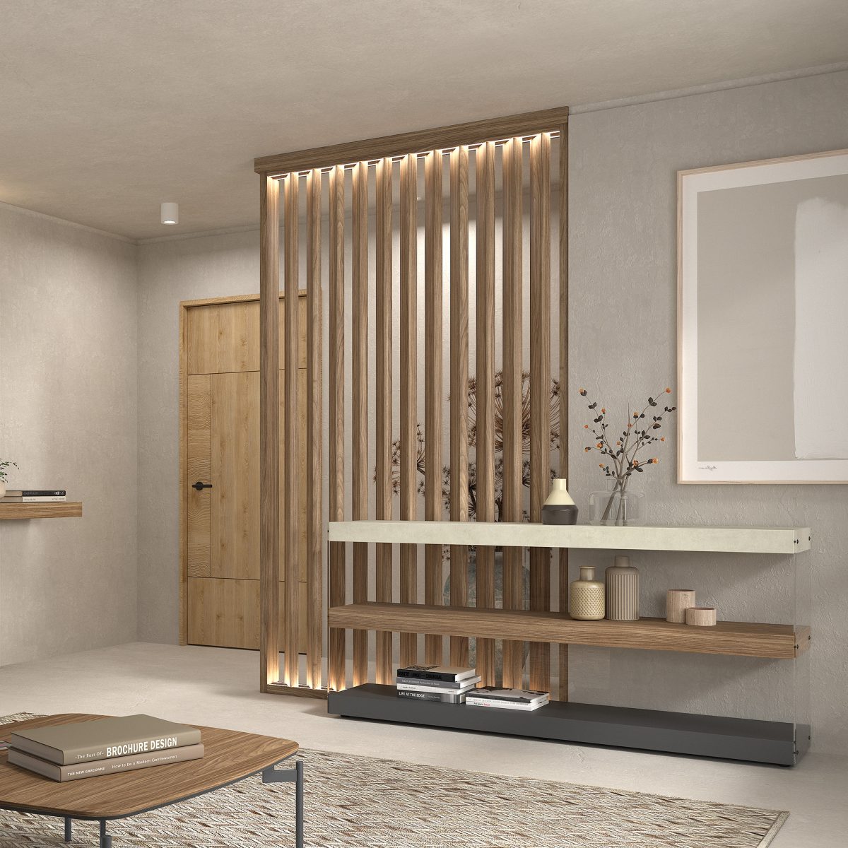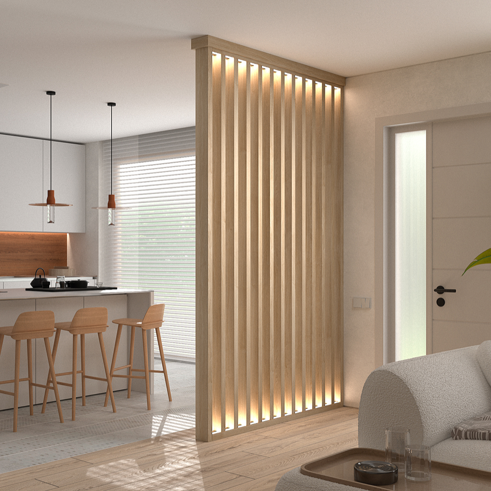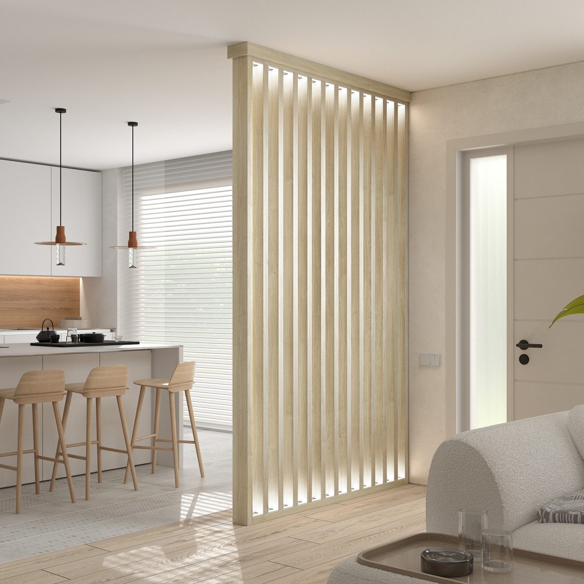 Separador de ambientes con Listones de madera giratorios, fabricados en ecomadera, con opción de acabado en diferentes colores del muestrario para la madera o colores Lisos, pudiendo combinar colores entre estructura perimetral y las lamas giratorias. Los listones centrales son giratorios. Foto en acabado Roble Natural.