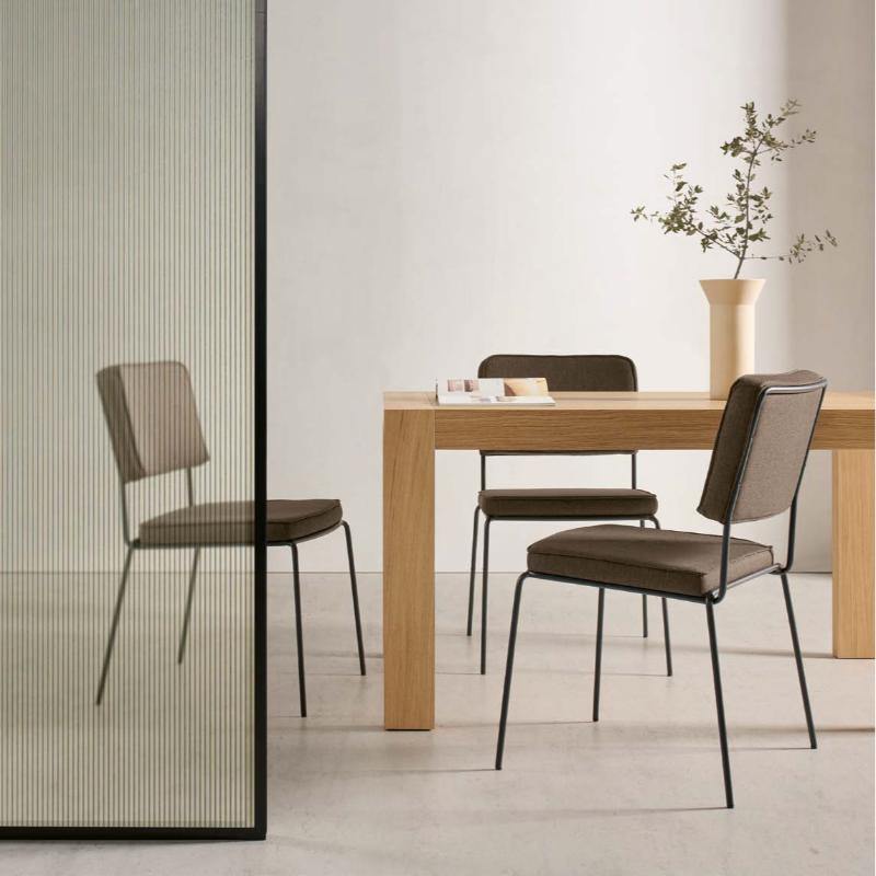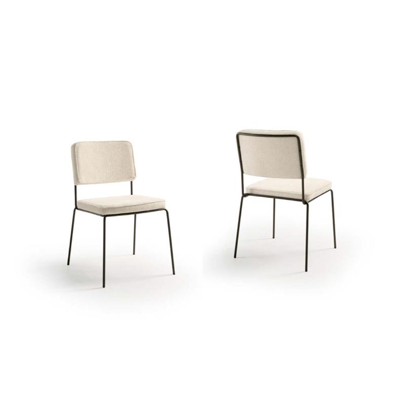 Silla de comedor tapizada con patas metálica en multitud de colores lacados mate a escoger. Fabricadas en diferentes tapizados a escoger, con asiento y respaldo tapizados y acolchados. Bonita silla que nunca pasará de moda y combina con cualquier mesa.