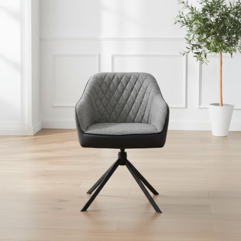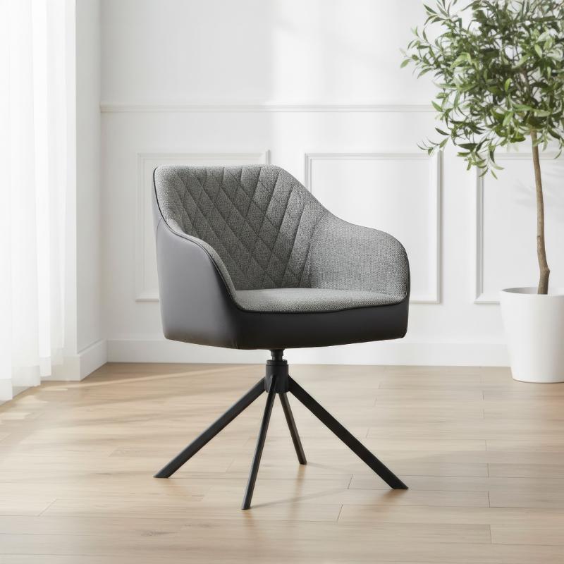 Silla giratoria Manus con reposabrazos, giratoria 180 grados y sistema de posición inicial automática, tapizada en tejido resistente y fácil limpiado WATER REPELLENT. Silla de comedor tapizada de patas metálicas negras muy resistente. Con un diseño muy actual, de estilo contemporáneo, pero que encaja en cualquier tipo de decoración a la perfección. Con asiento, respaldo y reposabrazos acolchados y tapizada en tela anti-manchas Lukka 90 – Gris, y la parte a afuera tapizada en piel sintética color antracita, un contraste muy elegante.
