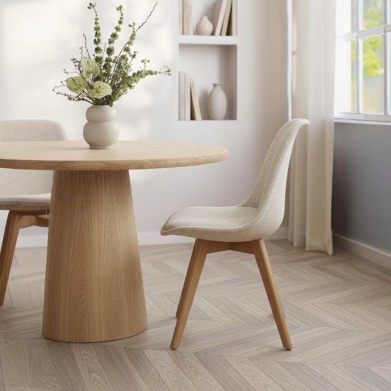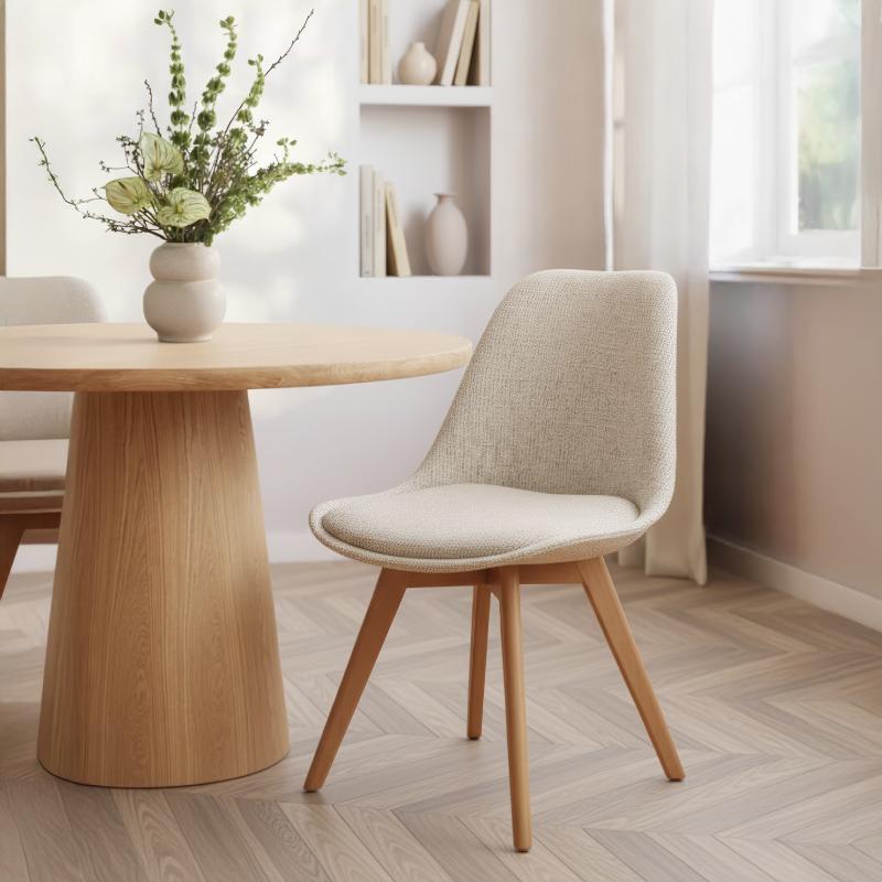 Silla Volda tapizada en tejido resistente y fácil limpiado EASY CLEAN. Silla de comedor tapizada de patas de madera de haya maciza muy resistente color roble alto. Con un diseño muy actual, de estilo contemporáneo, pero que encaja en cualquier tipo de decoración a la perfección. Con asiento y respaldo acolchados y tapizado LUKKA 003 – Beige.