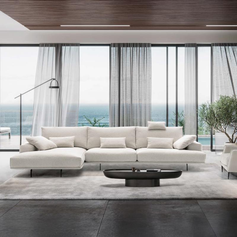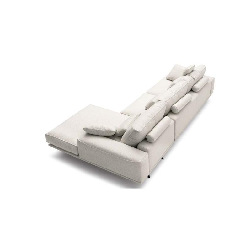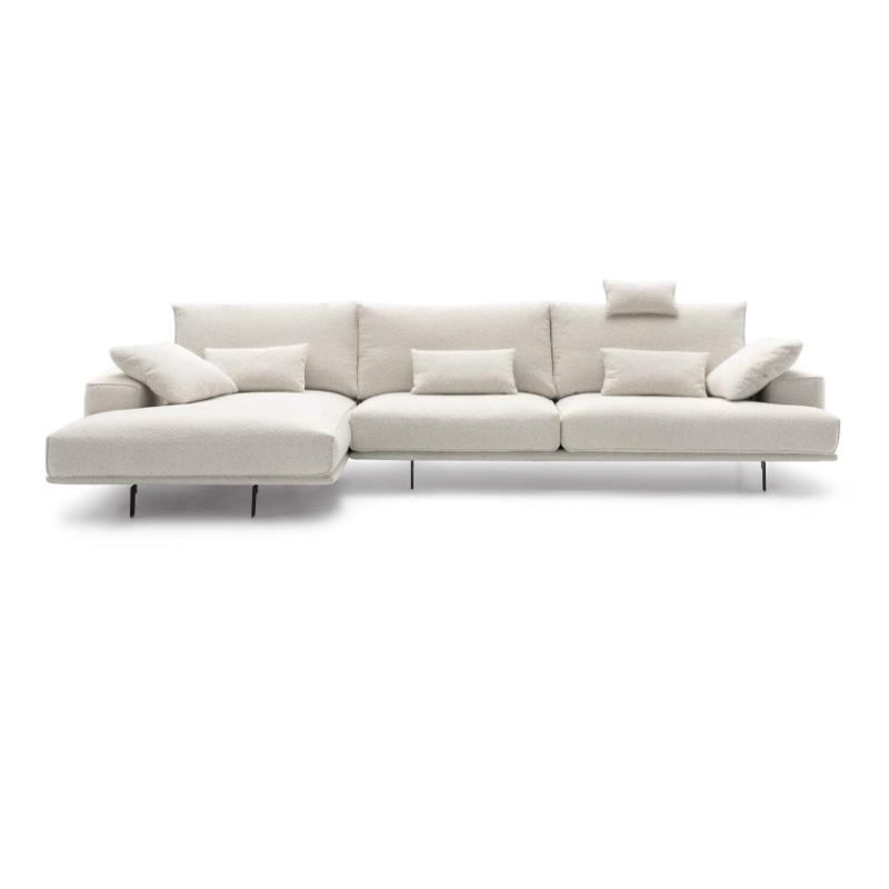 Sofá con Chaise longue en diferentes tapizados, con toques retro vintage, como sus patas metálicas modernas de diseño, que, además de poder elegirlas en varios colores, son aptas para que aspiradores tipo Roomba, circulen y limpie sin problemas, pasando por encima de las patas. Se puede complementar muy bien con otros elementos como un sillón o incluso un tres plazas.