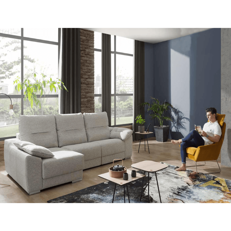 Moderno Sofá ideal para el día a día y para encontrar el descanso perfecto, gracias a sus asientos relax eléctricos motorizados, y Chaiselongue extensible eléctrico motorizado con arcón, accionados por sendas botoneras escondidas en los costados de los asientos.