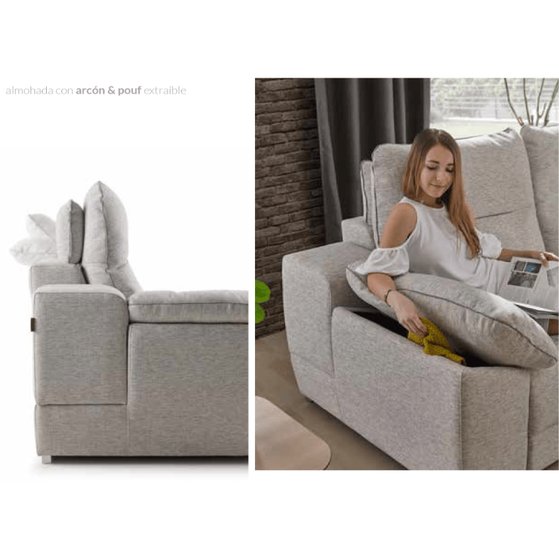 El módulo chaiselongue eléctrico de serie dispone de un arcón abatible bajo el asiento, con lo que contarás con un espacio extra de almacenaje. Y detalle del brazo almohada con arcón & pouf extraíble, y detalle del respaldo con cabezal reclinable, que optimiza el confort no solo en la zona lumbar, también en toda la zona cervical.