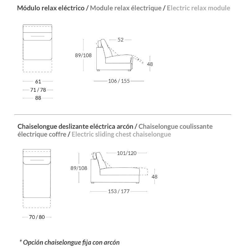 La posibilidad de customizar el sofá como tu quieras es un punto muy importante. La opción de elegir tu sofá en sistema fijo o sistema eléctrico, incluso la combinación de ambos sistemas. Con o sin chaise longue. Y opción también de Chaiselongue fijo con arcón o extensible eléctrico con arcón.