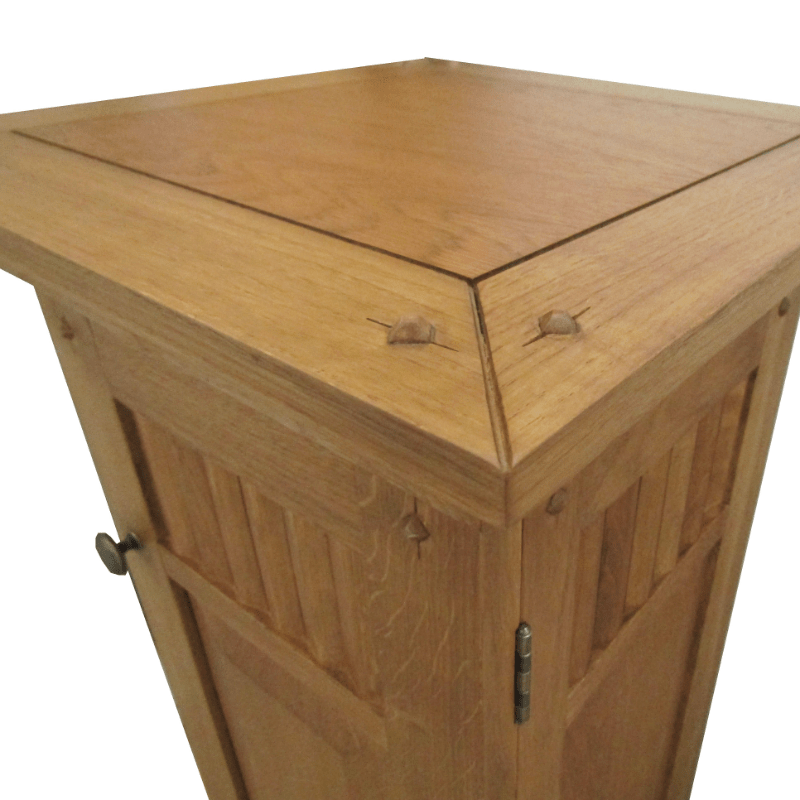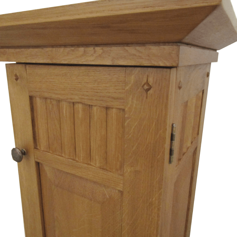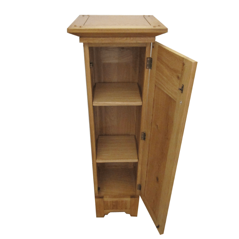 Rústica telefonera alta con puerta, con dos baldas interiores, con detalles tallados en la madera. Para poder almacenar todo aquello que necesites. Esta fabricado en madera de Roble maciza, con acabado natural de tacto fino y tiradores de hierro forjado pulidos.