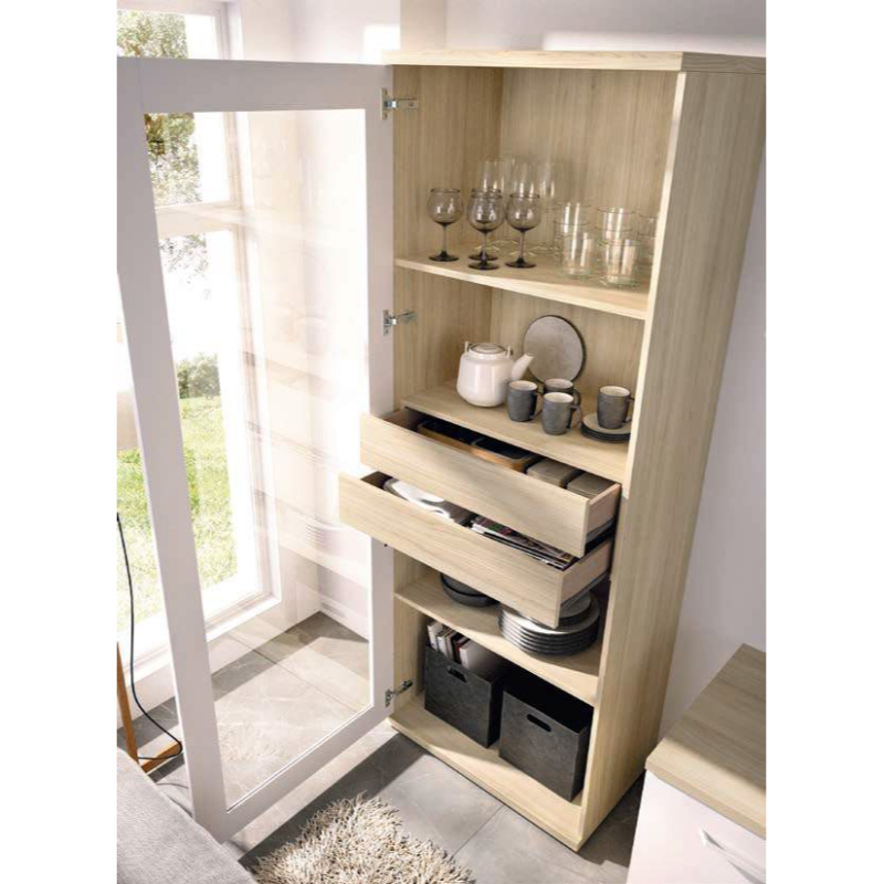 Preciosa vitrina vertical con una puerta de cristal con perfil en acabados madera o blanco, muy moderno y actual (adicionalmente se le puede incluir iluminación LED) y dos cajones en la parte central. Posibilidades de personalización al poder seleccionar el acabado tanto de la estructura como de los frentes de los cajones. Puede ir apoyada sobre dos tipos de patas, zócalo o pequeños tacos de 1 cm (sin apoyo).